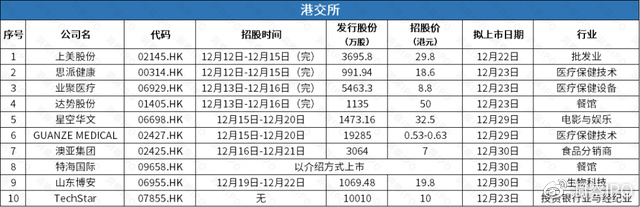 12月12日-12月18日,港交所有10家新股招股,其中有4家于当周完成招股。