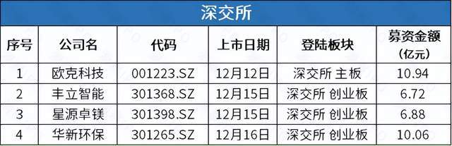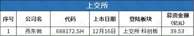 12月12日-12月18日,上交所科创板有1家公司上市;深交所主板有1家公司上市,创业板有3家公司上市。