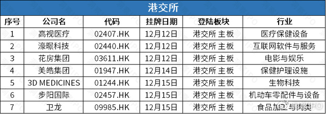 12月12日-12月18日,港交所有7家公司挂牌上市。