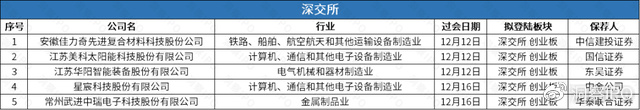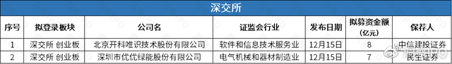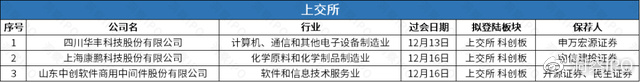 12月12日-12月18日,上交所有1家公司向科创板递交上市申请;深交所有2家公司向创业板递交上市申请。
