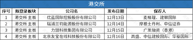 12月12日-12月18日,港交所有4家公司递交主板上市申请。
